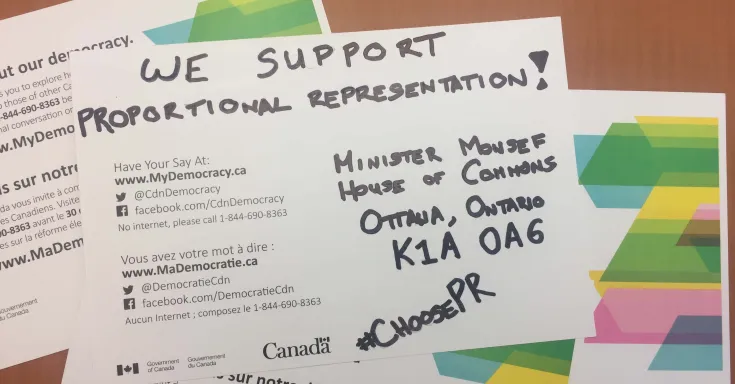 Citizens are making use of their mydemocracy.ca postcards to send a simple but important message back to the Minister of Democratic Institutions: we want proportional representation.